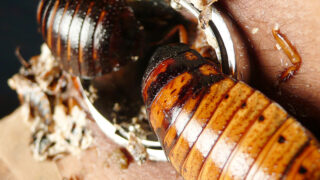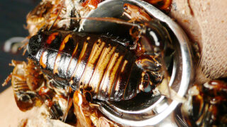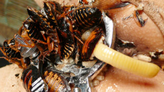 顔いっぱいにゴキブリを置き、ゴキブリを食す女