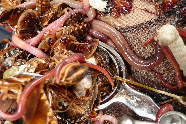 カイコ、ミミズ、ゴキブリをグチュグチュと押し込みます。